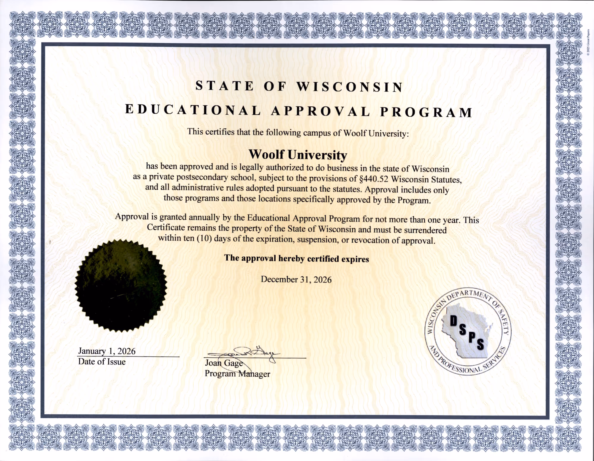 Woolf University is incorporated and officially approved in the State of Wisconsin under Wis. Stats. § 440.52 (10)(a), with approval granted on August 15th, 2022 under the Educational Approval Program of the Wisconsin Department of Safety and Professional Services, which is the body providing state licensure for universities. State approval is not the same as "accreditation."